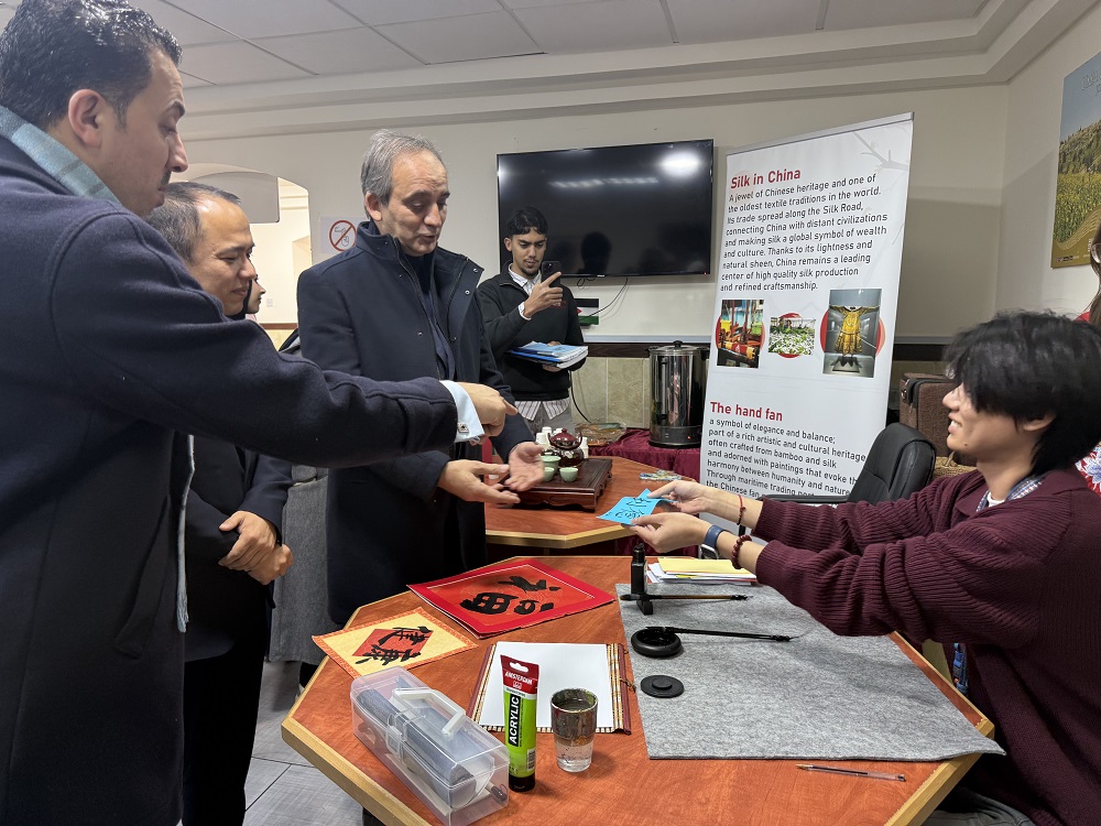 Accompanied by Mr. Zhao Xiaoqiang, Dr. Khaled Al-Zoubi visited the cultural booths and had warm and friendly exchanges with TAG-CI teachers. He sampled Chinese tea, read Chinese names under the guidance of the teachers, enjoyed the art of paper cutting, and appreciated traditional Chinese paintings, all in a lively and cordial atmosphere.